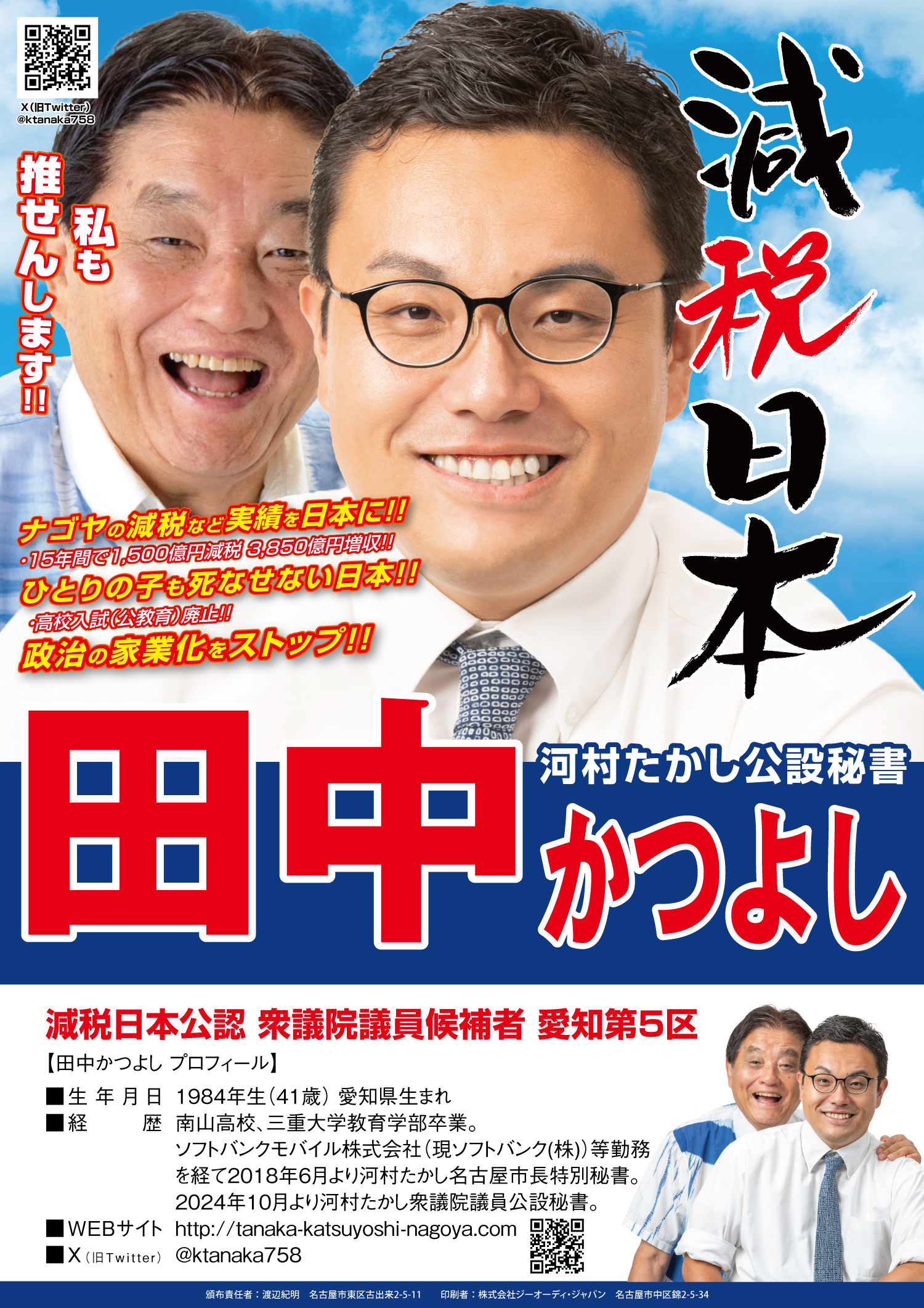 田中かつよしさん、6年半私、河村たかし名古屋市長の特別秘書(政策担当秘書)として二人三脚やってきました。名古屋市のことは当然ですが知り尽くしております。名古屋城天守閣木造復元、1人の子も死なせないナゴヤなど、必ず名古屋の皆様のお役に立つよう国会で活躍できます。 どえりゃあ応援してちょうよ!