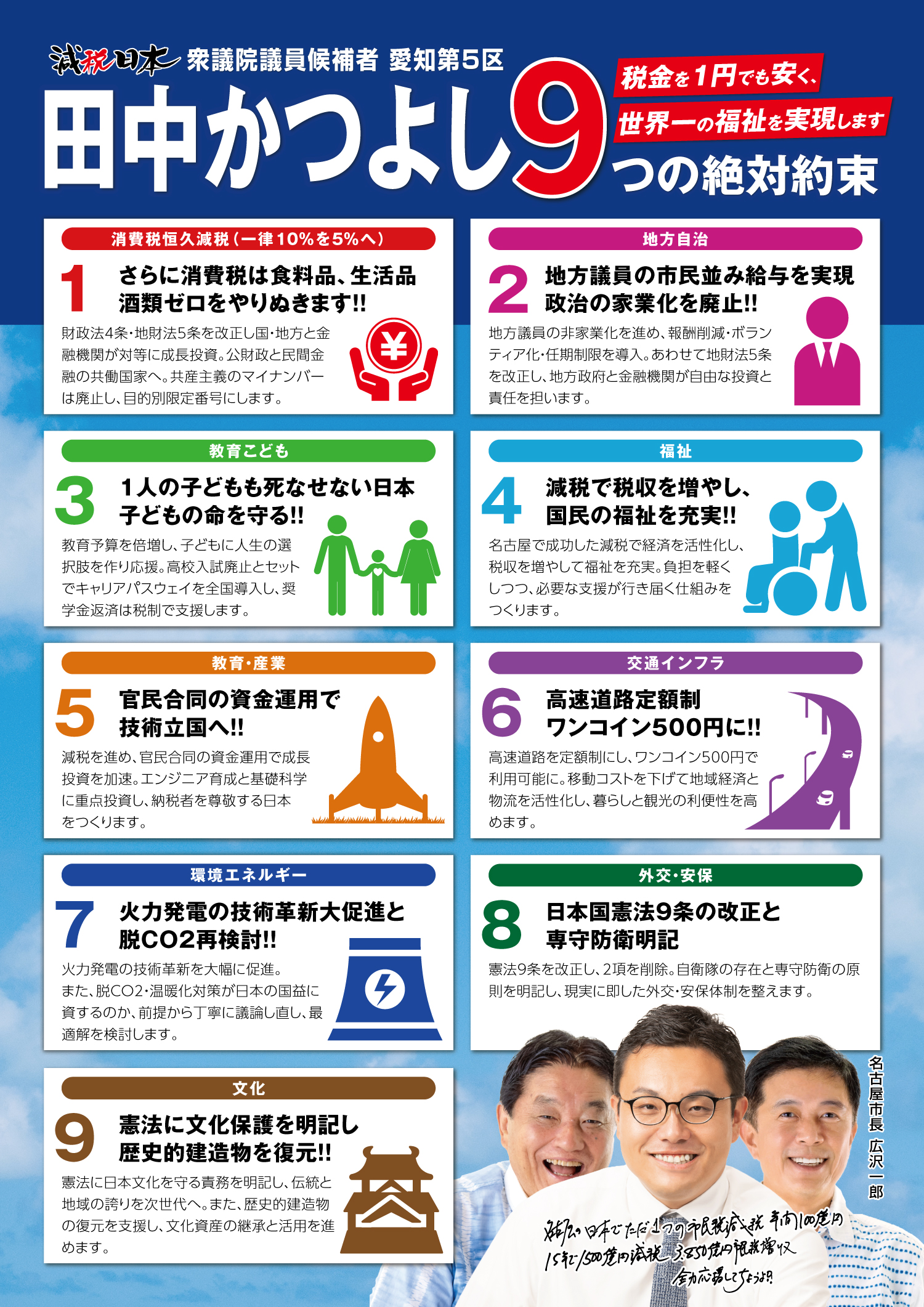 ⑨憲法に文化保護を明記し、歴史的建造物を復元!! 憲法に日本文化を守る責務を明記し、伝統と地域の誇りを次世代へ。また、歴史的建造物の復元を支援し、文化資産の継承と活用を進めます。